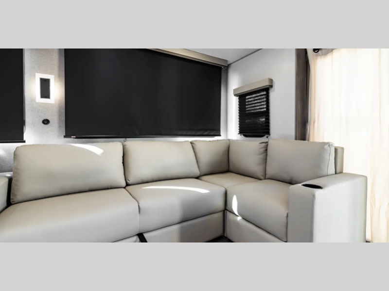 Each is built on a cambered structural steel l-beam frame so you can enjoy your RV for years to come, and EZ Lube axles with leaf spring suspension provide smooth towing. There are also premium JBL exterior speakers, a heavy duty tongue jack, universal solar prep, plus many more exterior conveniences. The interior will feel like a residential home with its GE appliances, seamless thermofoil countertops throughout, premium Serta mattress, and Congoleum woodplank linoleum flooring.