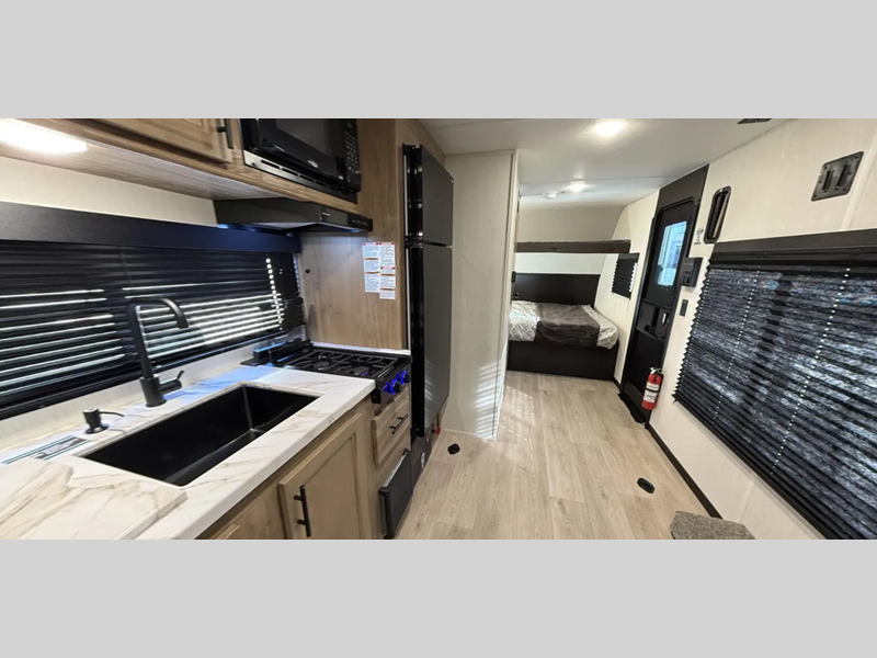 Sleeps 5 Length 22 ft 8 in Ext Width 7 ft 6 in Ext Height 10 ft 6 in Hitch Weight 655 lbs GVWR 5755 lbs Dry Weight 3879 lbs Cargo Capacity 1876 lbs Fresh Water Capacity 26 gals Grey Water Capacity 23 gals Black Water Capacity 28 gals Number Of Bunks 1 Available Beds Queen Number of Awnings 1 Garage Size 13 ft 11 in Awning Info 12' Axle Count 1 Shower Type Tub/Shower Combo Similar Floorplans