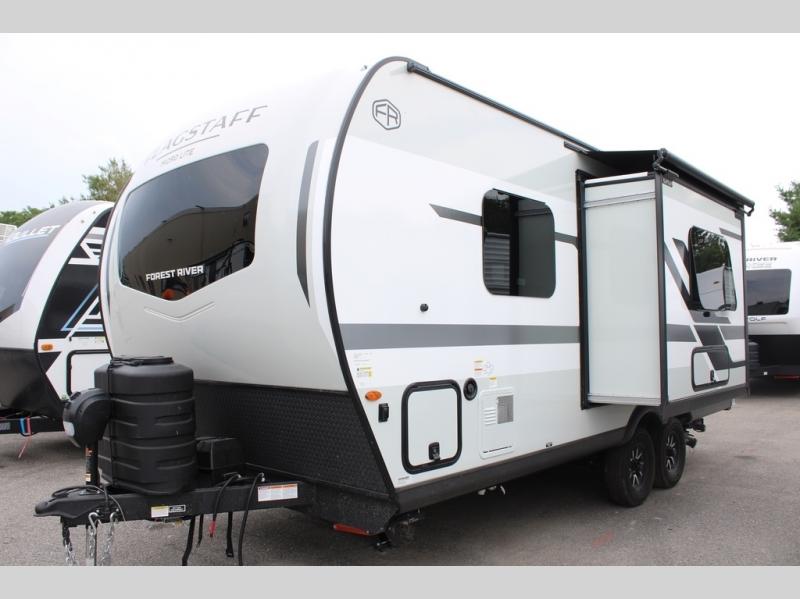 With any Flagstaff Micro Lite travel trailer by Forest River you will enjoy lightweight towing, durable construction, and added interior comforts to make each trip memorable! Each model features RoadTech tire pressure monitoring, Dexter Torflex axles, and nitrogen-filled Goodyear endurance tires for smooth towing from home to campground. The 6-sided aluminum framed construction provides a strong foundation so you can enjoy your RV for years to come, plus the radiant foil in the front cap, underbelly and slides help insulate your trailer. Additional exterior features include a 200W solar panel, back-up camera prep, frameless windows, and slam baggage doors. Each model includes the Great Expectations Package with roller shades, solid surface kitchen countertops, and hidden hinge cabinet doors. There is also an exterior hot/cold water port, outside speakers, a power tongue jack and stabilizer jacks, plus many more conveniences.