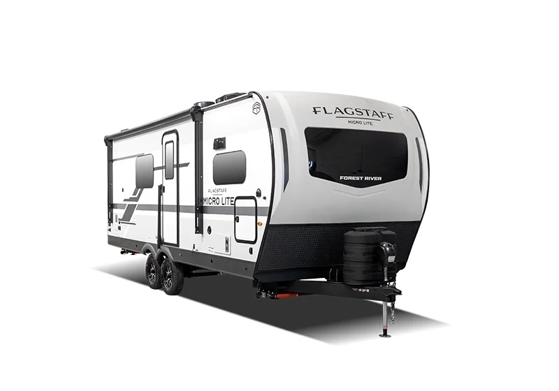 With any Flagstaff Micro Lite travel trailer by Forest River you will enjoy lightweight towing, durable construction, and added interior comforts to make each trip memorable! Each model features RoadTech tire pressure monitoring, Dexter Torflex axles, and nitrogen-filled Goodyear endurance tires for smooth towing from home to campground. The 6-sided aluminum framed construction provides a strong foundation so you can enjoy your RV for years to come, plus the radiant foil in the front cap, underbelly and slides help insulate your trailer. Additional exterior features include a 200W solar panel, back-up camera prep, frameless windows, and slam baggage doors. Each model includes the Great Expectations Package with roller shades, solid surface kitchen countertops, and hidden hinge cabinet doors. There is also an exterior hot/cold water port, outside speakers, a power tongue jack and stabilizer jacks, plus many more conveniences.