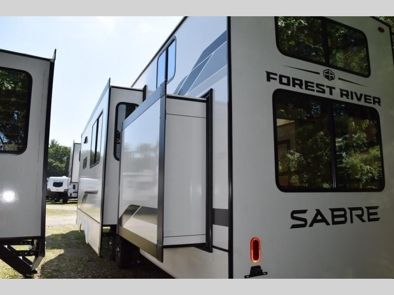 You will experience luxurious camping trips at an affordable price with any one of these Forest River Sabre fifth wheels! These models are durable and ready to travel anytime of the year thanks to features like the high-gloss gel-coat front cap with LED lighting, the PVC roof membrane, and the forced air underbelly with enclosed gate valves. The electric auto-leveling system makes setting up easy and safe, and the adjustable power awning with LED lighting will create an inviting outdoor living space. Each model includes a universal docking station which includes a black tank flush and an outside shower, and adjustable stable steps for you to enter and exit the unit safely. Inside, you will love the design of the ambient accent lighting in the living area, the real wood lumbercore cabinetry, and the linoleum flooring!