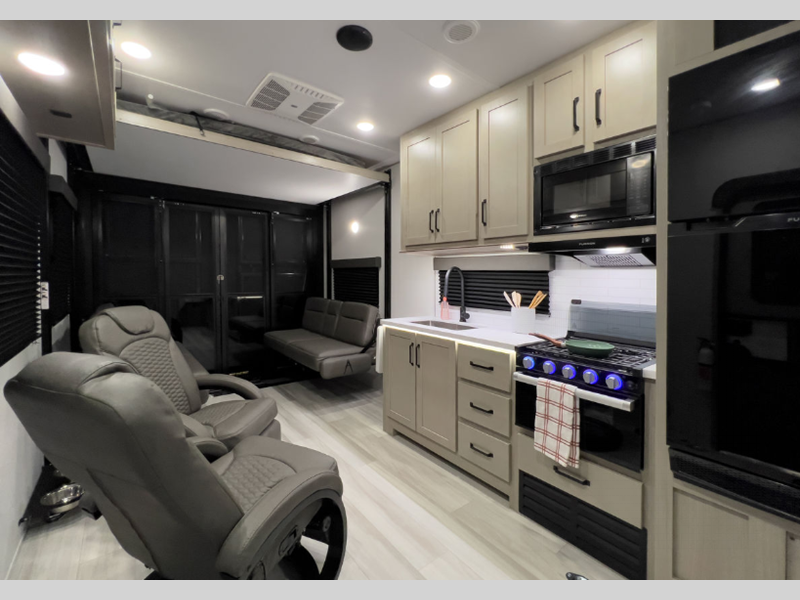 Sleeps 5 Slides 2 Length 33 ft 11 in Ext Width 8 ft 5 in Ext Height 12 ft 4 in Int Height 7 ft 7 in Hitch Weight 1368 lbs GVWR 13000 lbs Dry Weight 9153 lbs Fresh Water Capacity 90 gals Grey Water Capacity 78 gals Black Water Capacity 39 gals Tire Size ST235/80R16 LRE Furnace BTU 30000 btu Fuel Capacity 30 gals Available Beds Queen Refrigerator Type Stainless Steel Refrigerator Size 8 cu ft Cooktop Burners 3 Shower Size 27" x 36" Number of Awnings 1 Garage Size 16 ft 6 in LP Tank Capacity 20 lbs Water Heater Type Tankless AC BTU 28500 btu TV Info LR 40" TV Awning Info 18' w/LED Accent Lighting Axle Count 2 Number of LP Tanks 2 Shower Type Walk-In Shower Electrical Service 30 amp Similar Floorplans