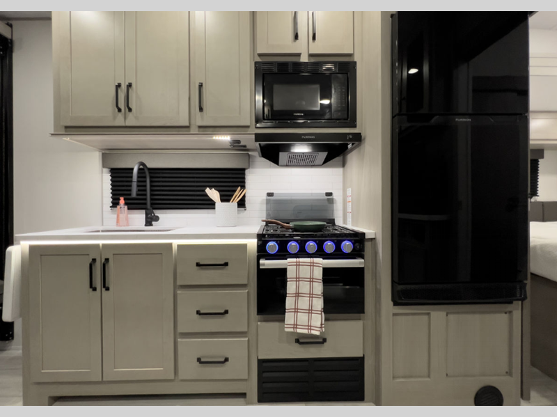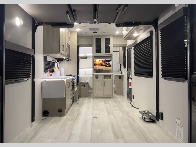 Each model also includes a universal docking center, a fiberglass front cap with paint and LED lighting, a heated and enclosed underbelly for four seasons of traveling, and a dovetail rear end. The Momentum G-Class also comes with large panoramic windows, residential cabinetry, motion-sensor lighting, and stainless steel-accented appliances. The fun will not stop when listening to the exterior speakers, and the awning with LED lighting will create an outdoor living space you are sure to love.