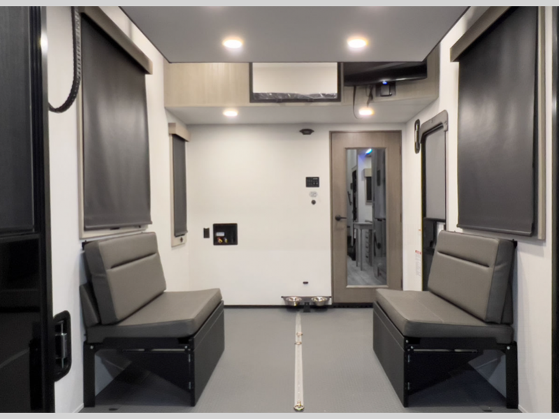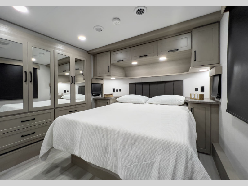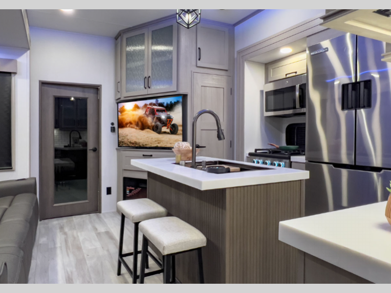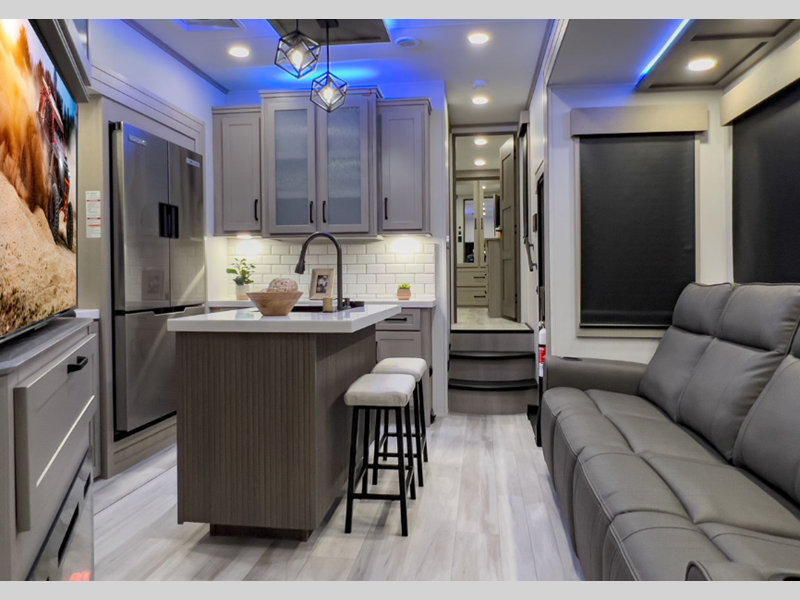 Each is built on a drop-frame chassis with MORryde CRE3000 suspension system and a rubber pin box providing smoother towing, improved towability and better protection from damaging rock shock. The enclosed fuel pump station provides gas fills, and the Weather-Tec package provides four seasons of traveling. The Luxury Interior package comes with a chef-inspired range and oven, recessed LED puck lighting, plus an LED TV in the living room to keep you entertained on rainy days.
