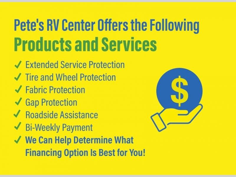 Pete's RV Center - Indiana is not responsible for any misprints, typos, or errors found in our website pages. Any price listed excludes sales tax, registration tags, and delivery fees. Manufacturer pictures, specifications, and features may be used in place of actual units on our lot. Please contact us @219-206-2076 for availability as our inventory changes rapidly. All calculated payments are an estimate only and do not constitute a commitment that financing or a specific interest rate or term is available. Estimated monthly payments are calculated with down payment and do not include tax, title, prep, or other applicable fees. You may qualify for a lower payment and/or rate. Submit an online credit application to learn more.
