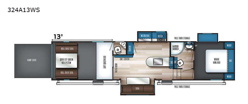 Whether you are looking for a weekend away or a month-long adventure, this Vengeance Rogue toy hauler will be just what you need to make every trip magical! The full and half bath are so convenient to have because they give you more space to get ready each morning, and the queen loft and quick-set queen bed system in the 13' separate garage provide a cozy spot for your guests or your kids. Spend your night in extreme comfort on the king-size bed in the front master suite and head out to the kitchen to grab a late-night snack from the pantry if you get a little hungry.